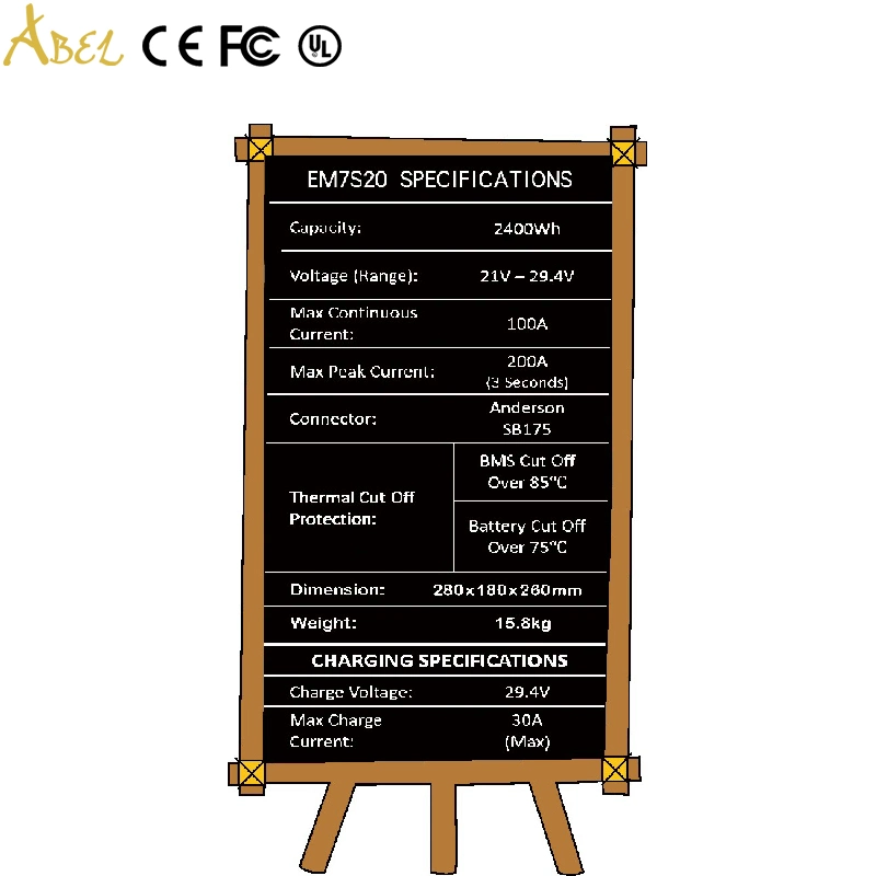 Capacity2500WHWorking Voltage(Range)21-29.4VMax continuous current100AMax Peak Current200A ( 3 Seconds )ConnectorAnderson  SB175Thermal cut off ProtectionBMS cut off over 75°CBattery Cut off over 60°CDimension280*180*260MMWeight15.8KGCharge Voltage29.4VMax Charge Current30A (MAX) FAQ:Q1: How to choose a right b